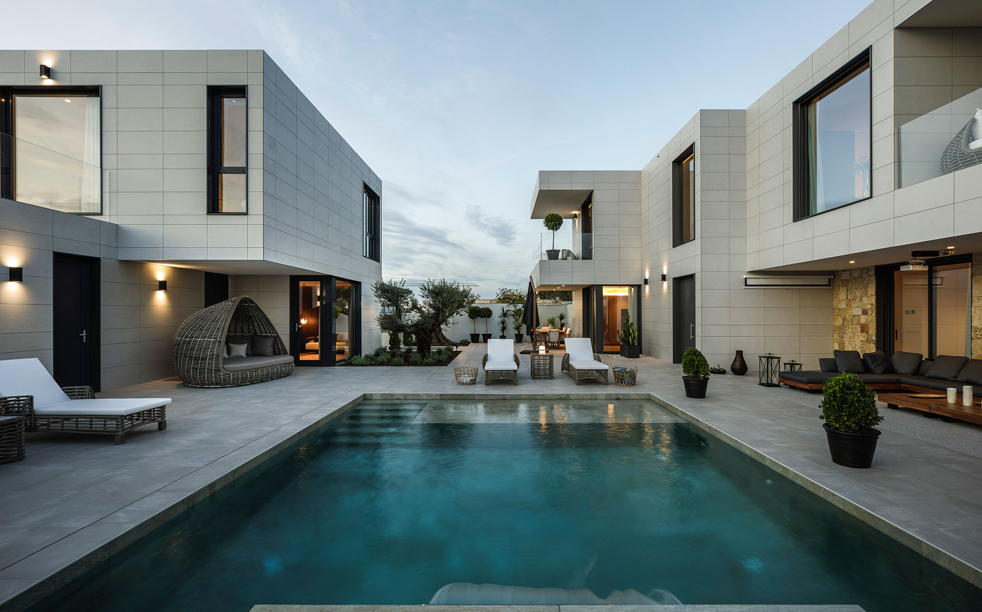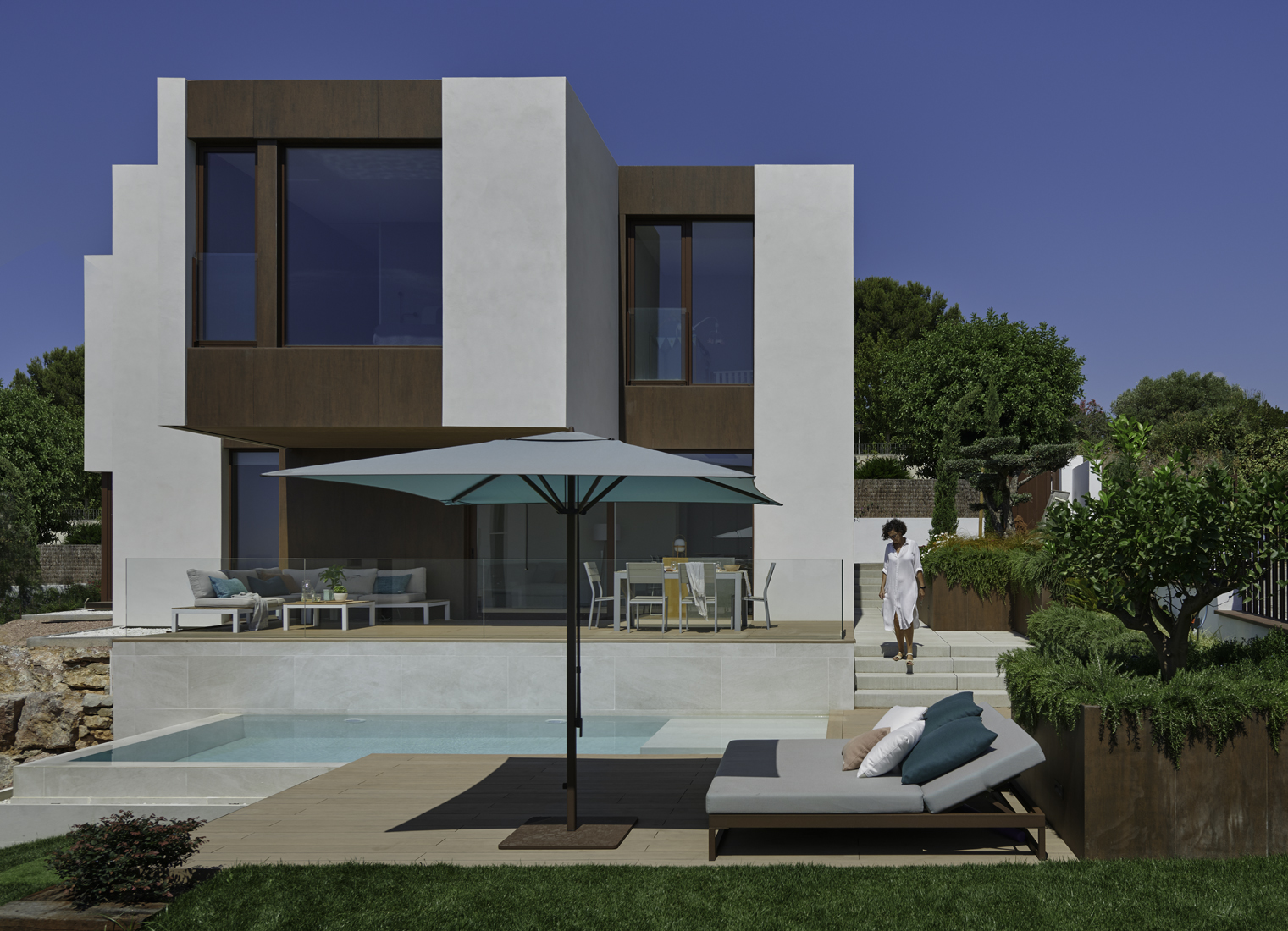 All das. Einschließlich der äußeren „Bebauung“: Garage, Schwimmbad, Garten, Umzäunung … Komplette Landschaftsgestaltung Studie. Auf Wunsch des Kunden bieten wir auch ein Innenausstattungsprojekt an, das alle Möbel umfasst. Deshalb kümmert sich inHAUS um den gesamten Prozess und bietet einen geschlossenen schlüsselfertigen Preis. Keine Kostenüberschreitungen. Keine Überraschungen. Ohne die klassischen Probleme des traditionellen Bauwesens, wie z. B. verzögerte Fristen. Wir verpflichten uns, unsere Häuser innerhalb von 5 Monaten nach der Erteilung der Genehmigung zu liefern.