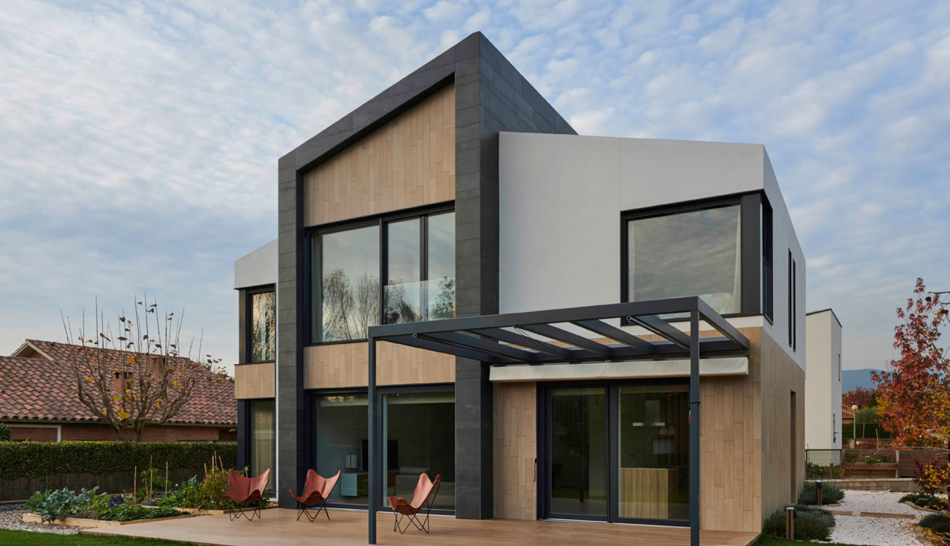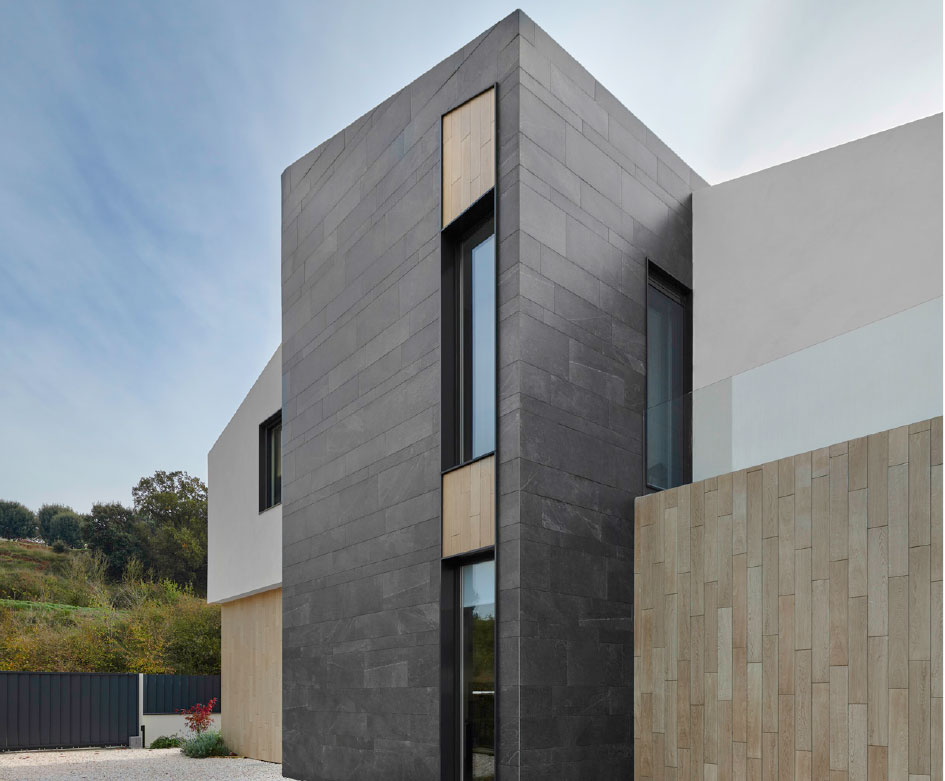 “The exterior materials of the house are presented as a contemporary reinterpretation of those materials that have commonly been used in this type of alpine environments. Thus, the slate or wood-finish ceramic claddings, together with the white plastering and the dark-toned metal carpentry, make the volumes get an attractive contemporary character, easy to mantain against these typical climatic aggressions of the area in which it is located.”