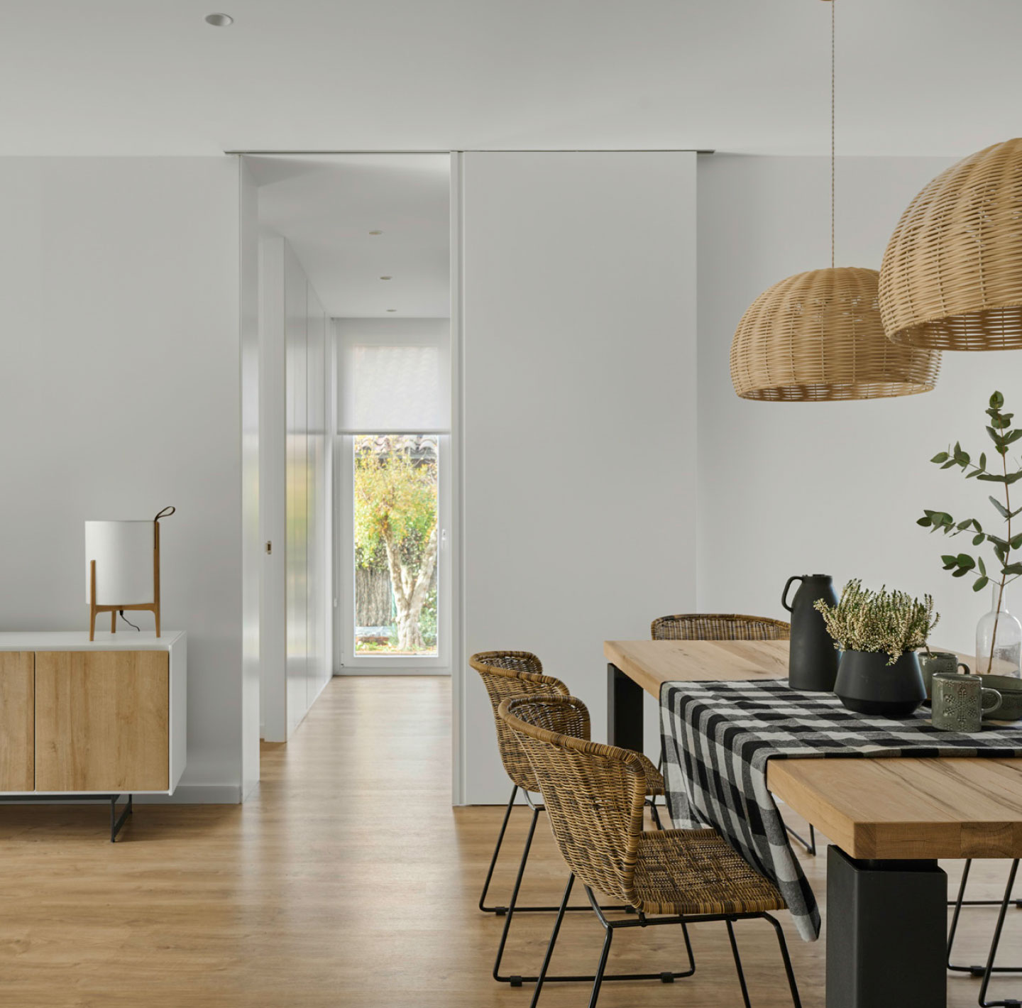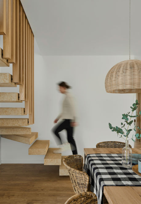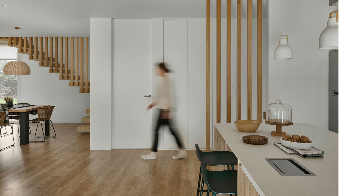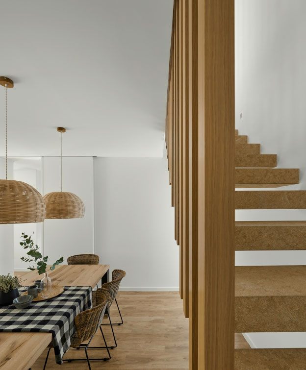 Once in the hall of the house, located on one of the sides of the first ground floor, we are greeted by a warm lattice made of vertical wooden floor-to-ceiling slats that visually separates this space from the adjacent open-plan kitchen.