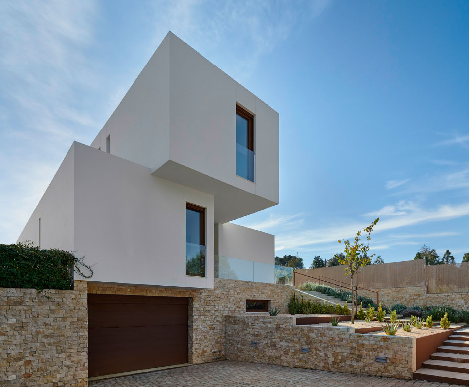 In the surroundings of Barcelona, this house is located in a landscape that combines the charm of the sea breeze with the Mediterranean forest. A set of rounded volumes that combine continuous white cladding on its façades with the stone masonry of the plinth, that surrounds the subway parking, give a typical Mediterranean vernacular character to this house that has all the comforts and facilities of the 21st century.