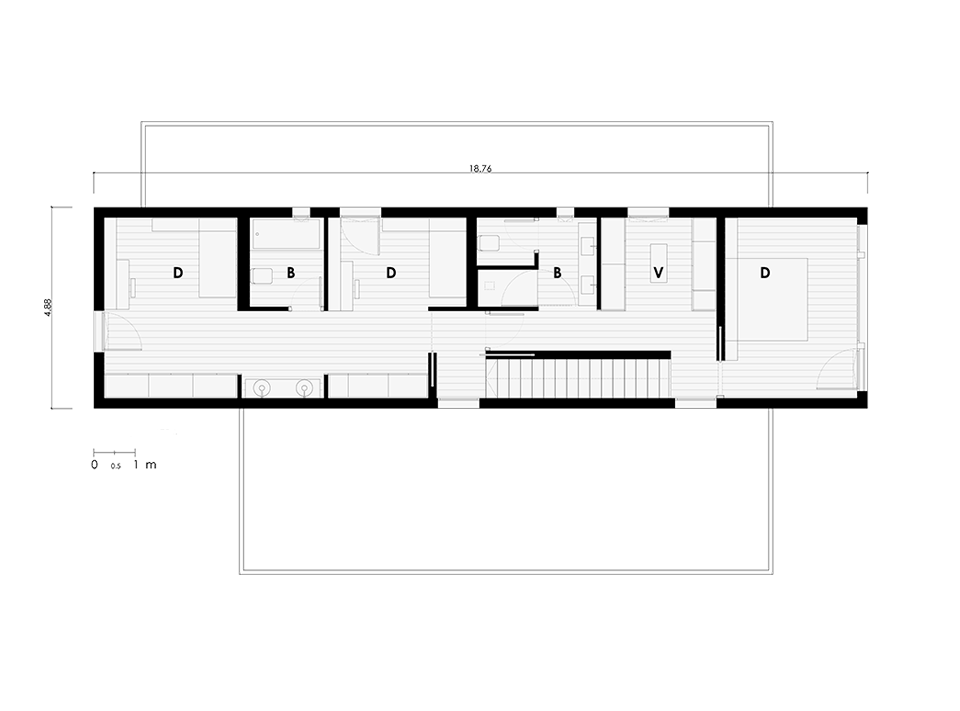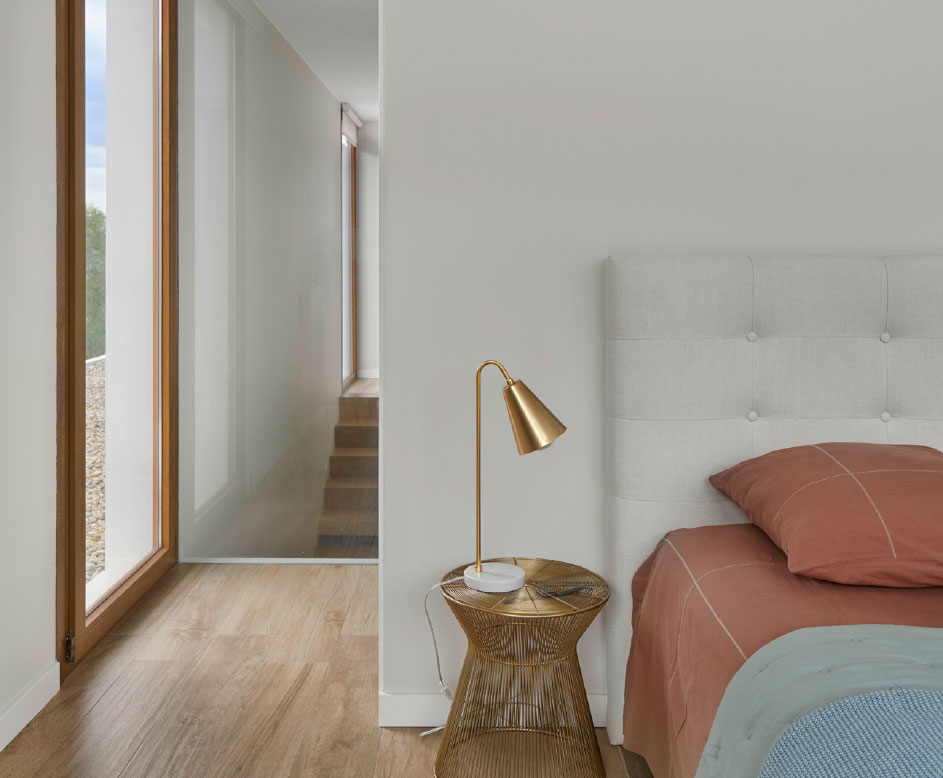 On the first floor there are two very different areas divided by the staircase. On the one hand we have the master bedroom and its wide views to the garden that also owns a bathroom and walk-in closet separated from the sleeping space by a discreet sliding door.
