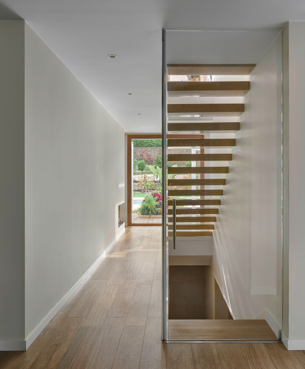 On the ground floor we find the living-room separated from the access space, where the sculptural staircase is located, but visually connected thanks to the double-sided fireplace that enhances the fluidity of these spaces, leading to the terrace at the back and its amazing garden.