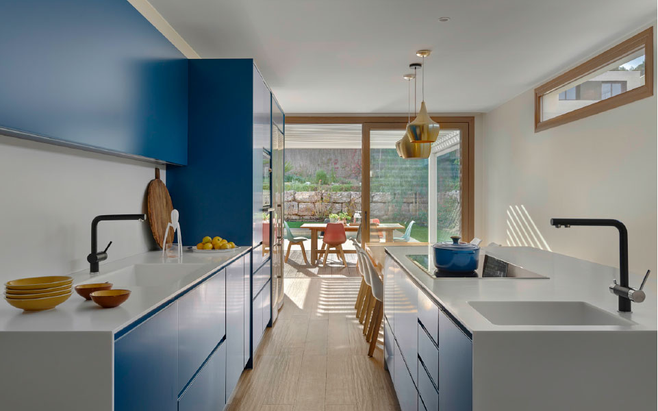 On the opposite side we find the large kitchen in blue tones that communicates seamlessly with the access space and the living-room area along the large glass façade that blurs the boundaries between indoor and outdoor space. On this same level we also find a service area and a large pantry located in the adjacent space to the kitchen.