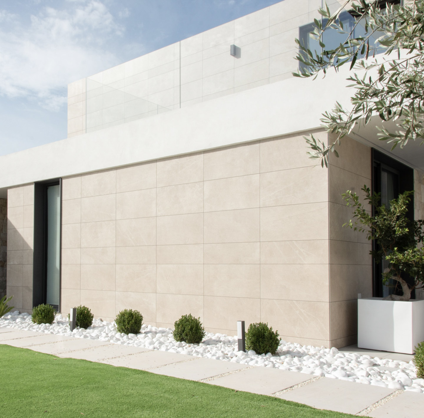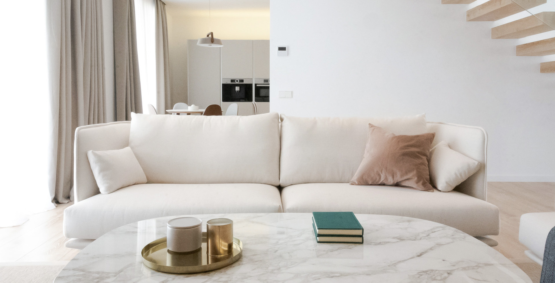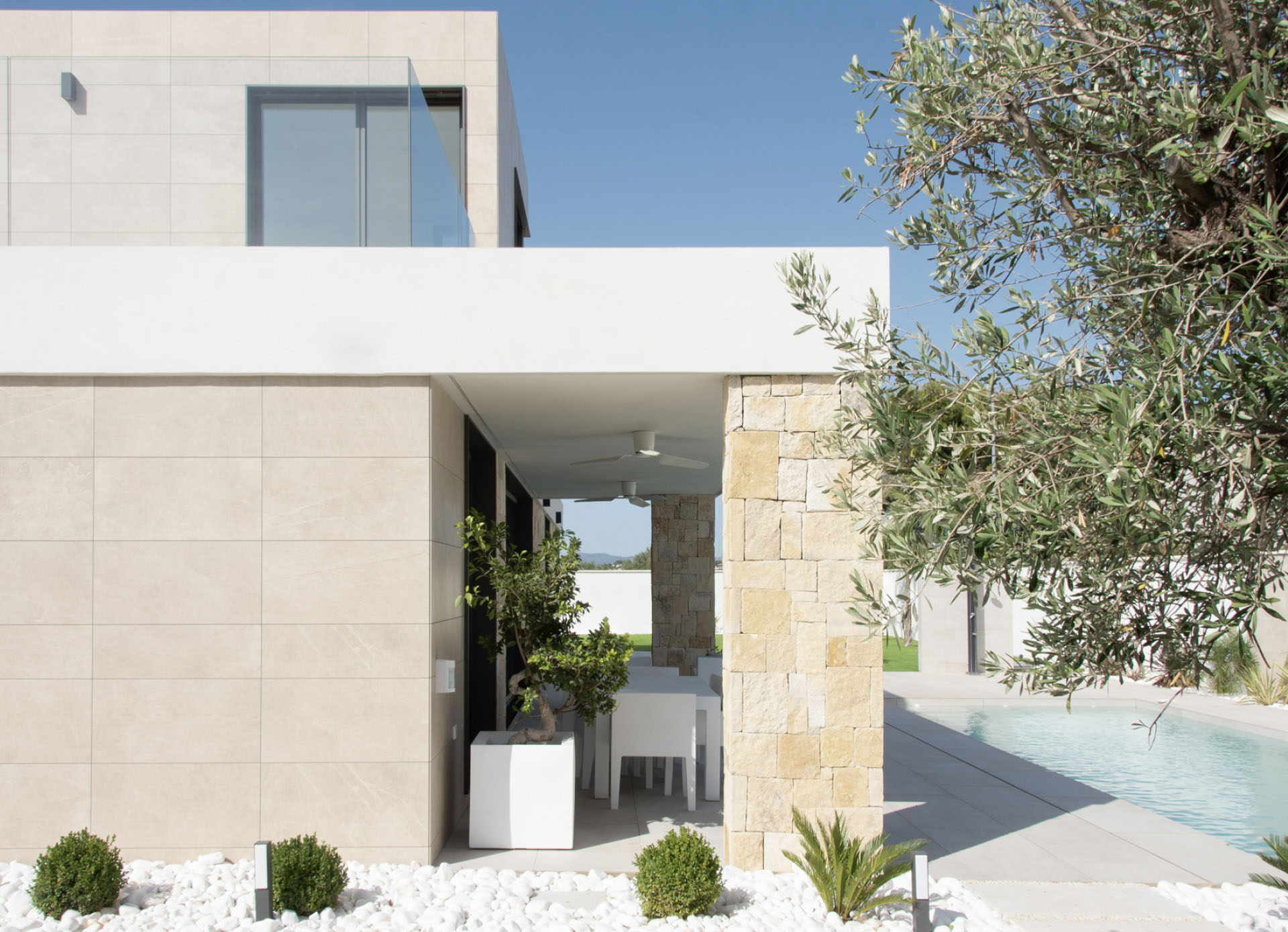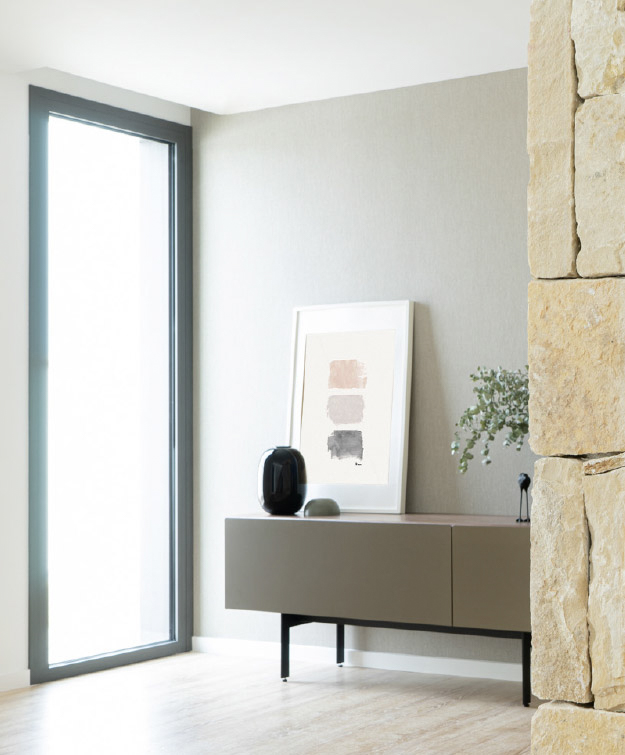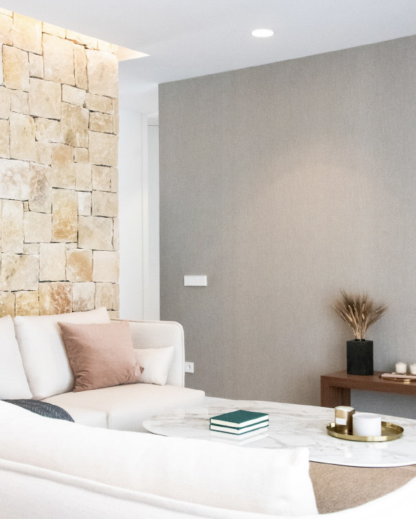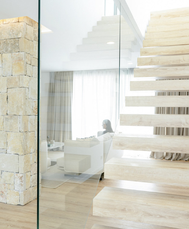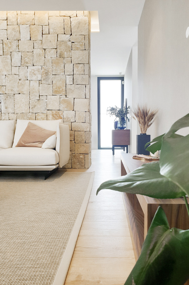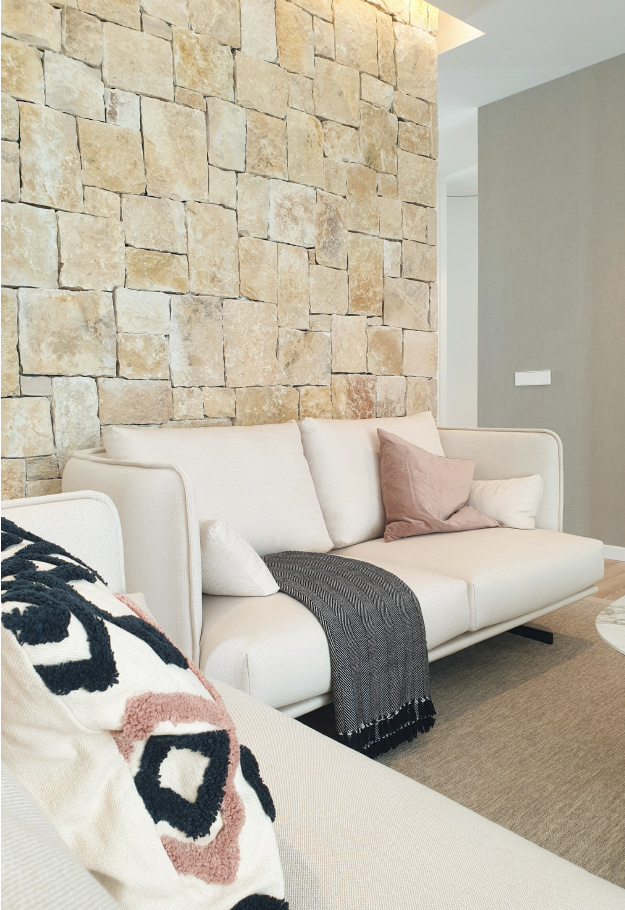 “The texture of natural stone is introduced from the façade to the interior of the house giving warmth to the domestic space. The soft tones join us in the interior design, both in the architectural textures and in the furniture pieces that complete the design.”