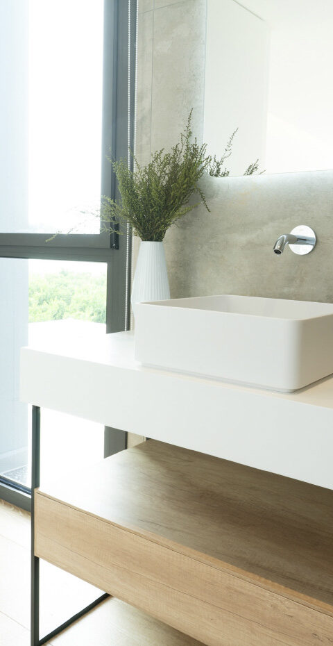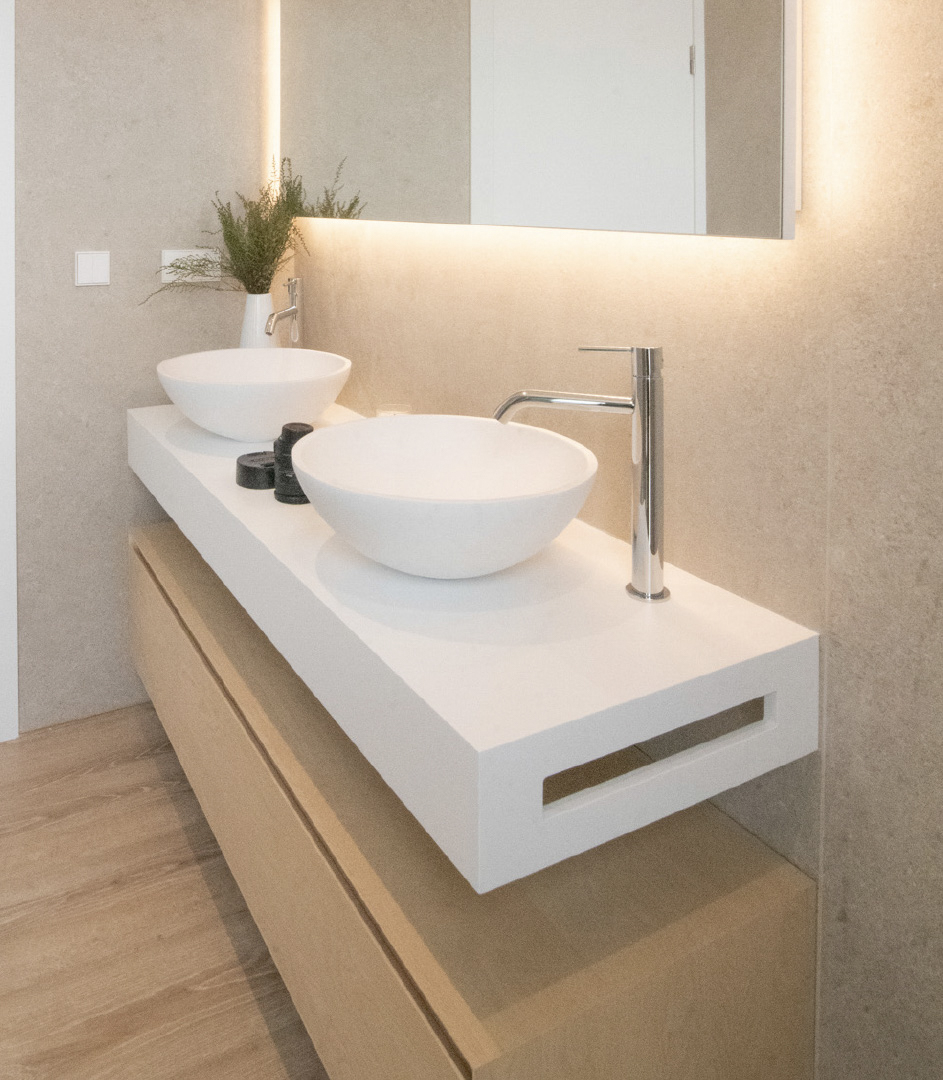 The most intimate spaces, the bathrooms. They were turned into joyful spaces thanks to the natural textures and the study of light. A haven of peace in your home.