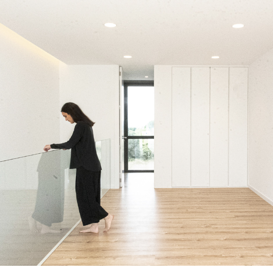 After climbing the staris, illuminated by the large windows that connect it with the exterior, we arrive to the upper floor. The master bedroom with its own bathroom is located in a privileged position occupying the volume that overhangs the terrace of the first floor while generating a covered area onto it.