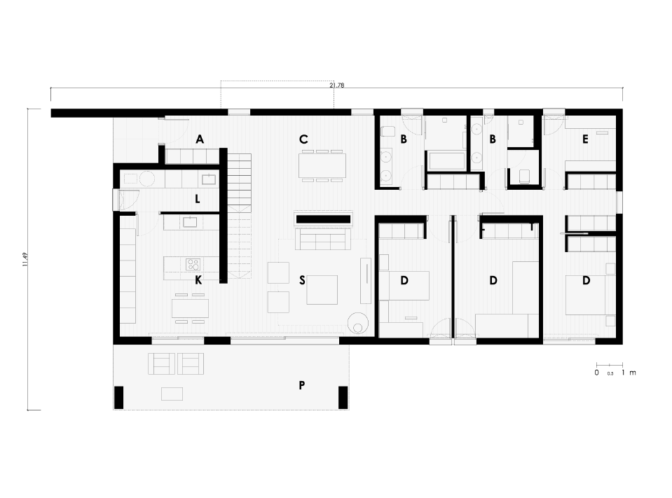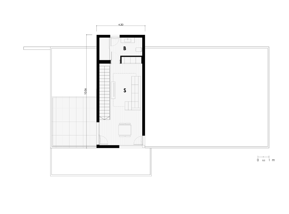 The house is designed throughout two very powerful volumes. A ground floor in a single compact volume on which appears a new perpendicular flying volume to the lower one generating an outdoor porch space that connects the living area with the dining-room and garden.