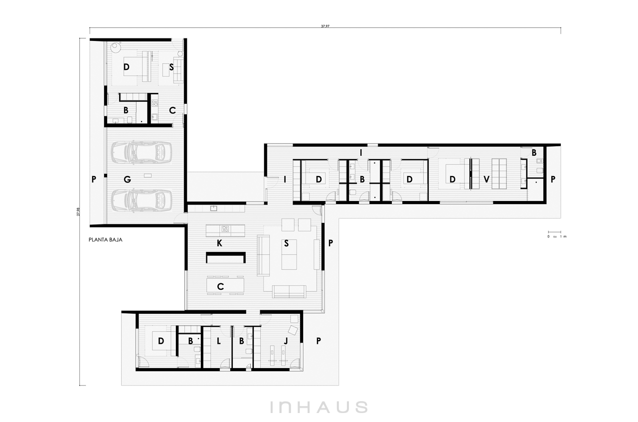 Single-story industrialized design house composed of four wings that stretch across the plot and are connected by the heart of the house, the living room. The house is proposed in a High Tech style, marked by the duality of its materials and its horizontal design lines.