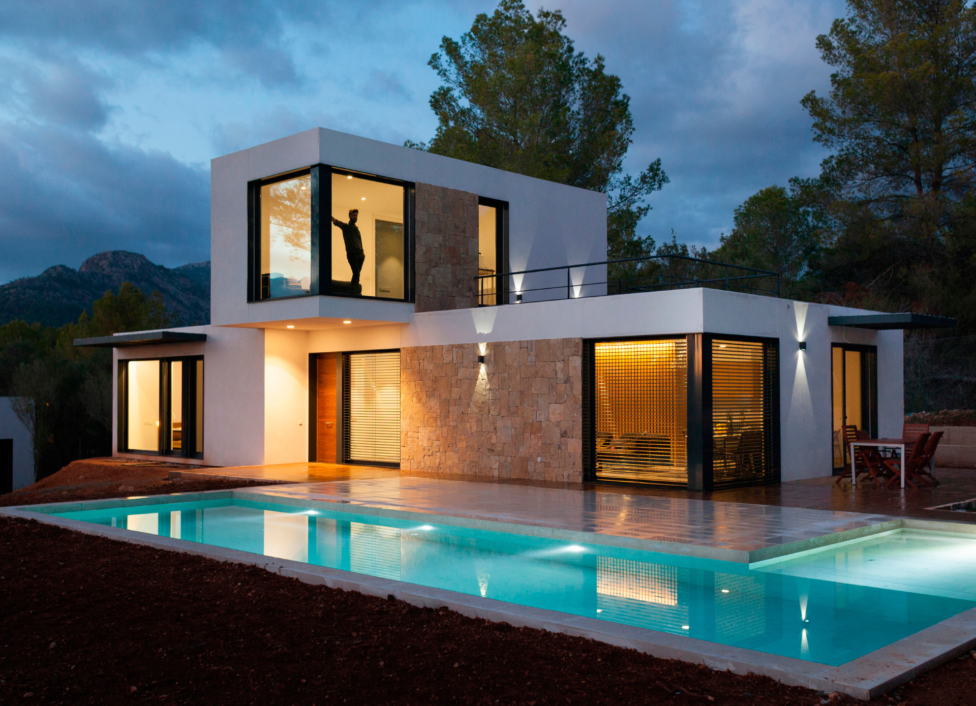 Dieses Modulhaus ist das Modell Motril. Es ist nicht nur eines unserer Fertighäuser: virtuelle Fotos und reale Bilder und Videos des ersten von inHAUS aufgestellten vorgefertigten Schwimmbads.