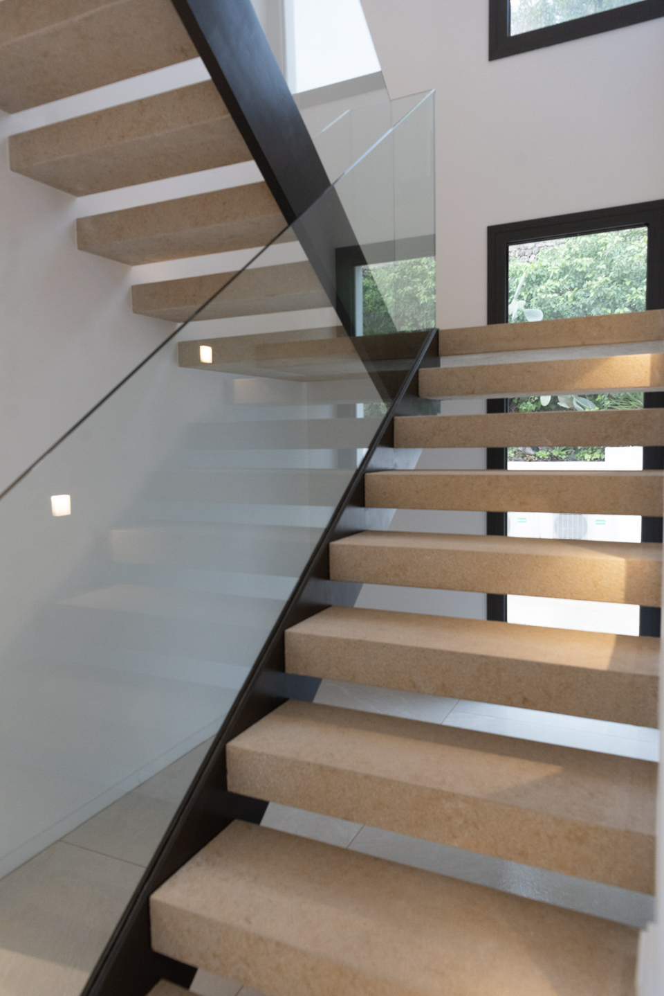 Natürliche Texturen wie die Treppenstufen stehen im Dialog mit den Pflanzen, die durch die großen Fenster, die natürliches Licht durch alle Fassaden einlassen, eingeführt wird.