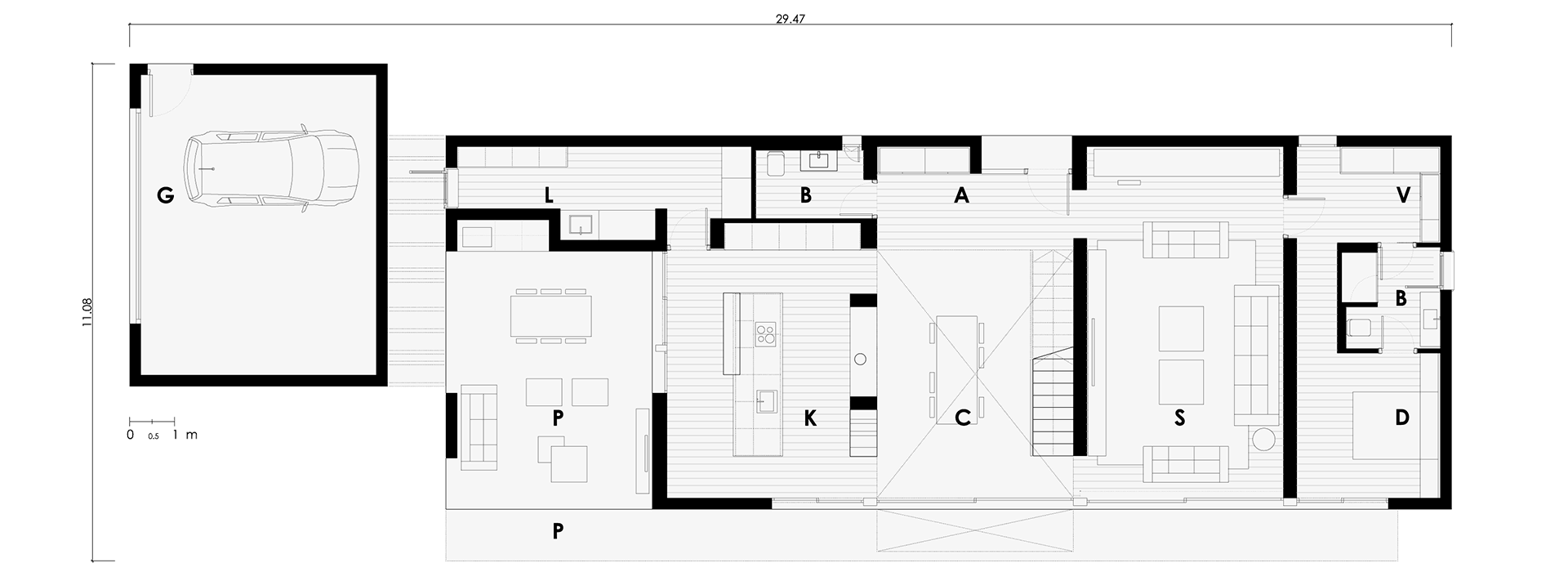 Im Erdgeschoss befindet sich die Tageszone mit drei verschiedenen, aber miteinander verbundenen Räumen: Wohnzimmer, Esszimmer, Küche und eine große überdachte Veranda, sowie ein großzügiges Schlafzimmer und alle Serviceeinrichtungen.