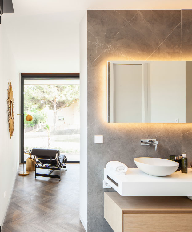 Mit einer Aufteilung, die auf einem sorgfältig erarbeiteten Raumprogramm basiert, verfügt jedes Zimmer über ein eigenes komplettes Bad und ein Ankleidezimmer. Die Verpflichtung, jedem Bewohner des Hauses einen eigenen, von natürlichem Licht durchfluteten Raum zur Verfügung zu stellen.