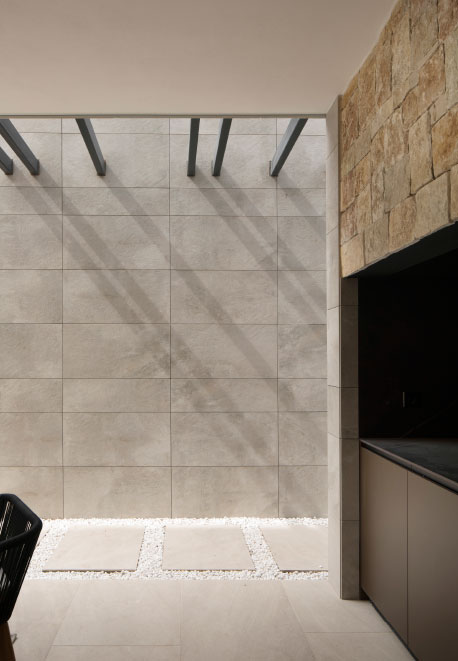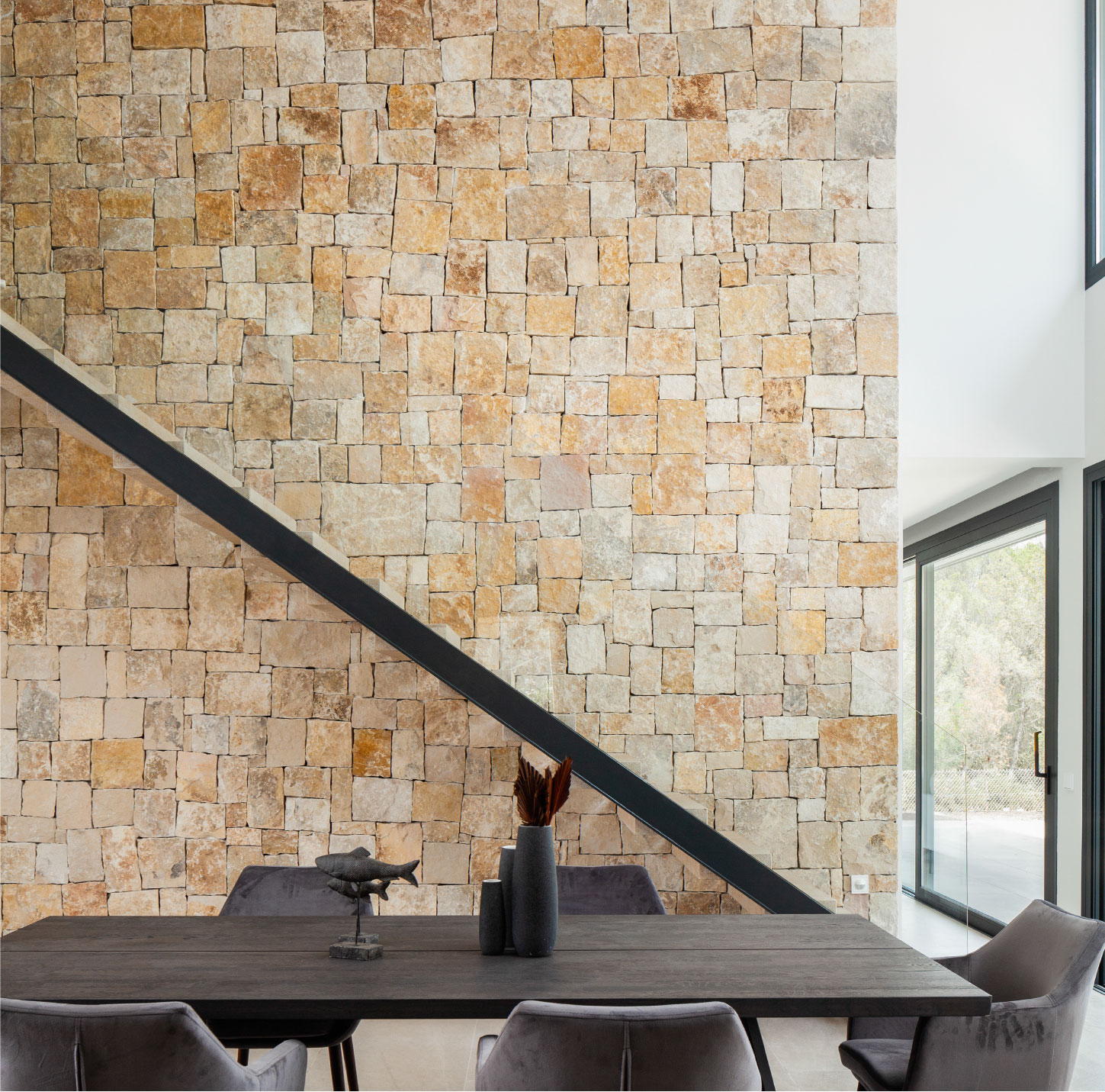 „Ein Haus, das den Charme der Baleareninsel dank der Kombination von natürlichen Materialien wie Stein und Holz und seiner raffinierten Linienführung einfängt. Wir werden von einem großen Raum mit doppelter Höhe empfangen, der dank einer japanischen Treppe mit Steinstufen beide Geschosse miteinander verbindet und von einer spektakulären, mehr als 7 Meter hohen, mit Naturstein verkleideten Wand gekrönt wird.“