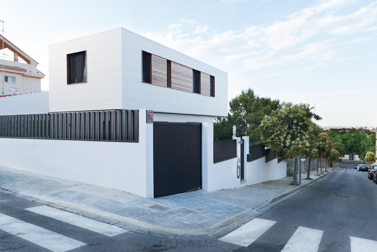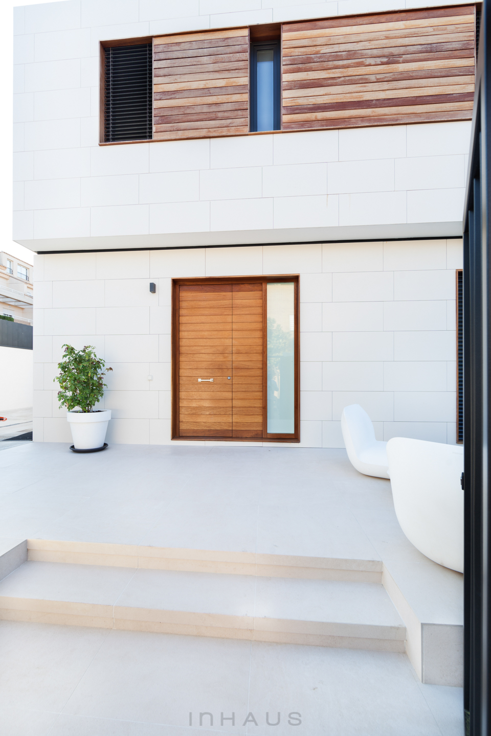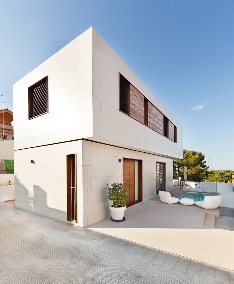 Die hinterlüftete, mit hochwertiger Keramik verkleidete Fassade steht im Kontrast zu den Außenverkleidungen aus behandeltem Holz. Modernes Design, das nie aus der Mode kommt und ein Minimum an Pflege erfordert. Schönheit und Funktionalität.