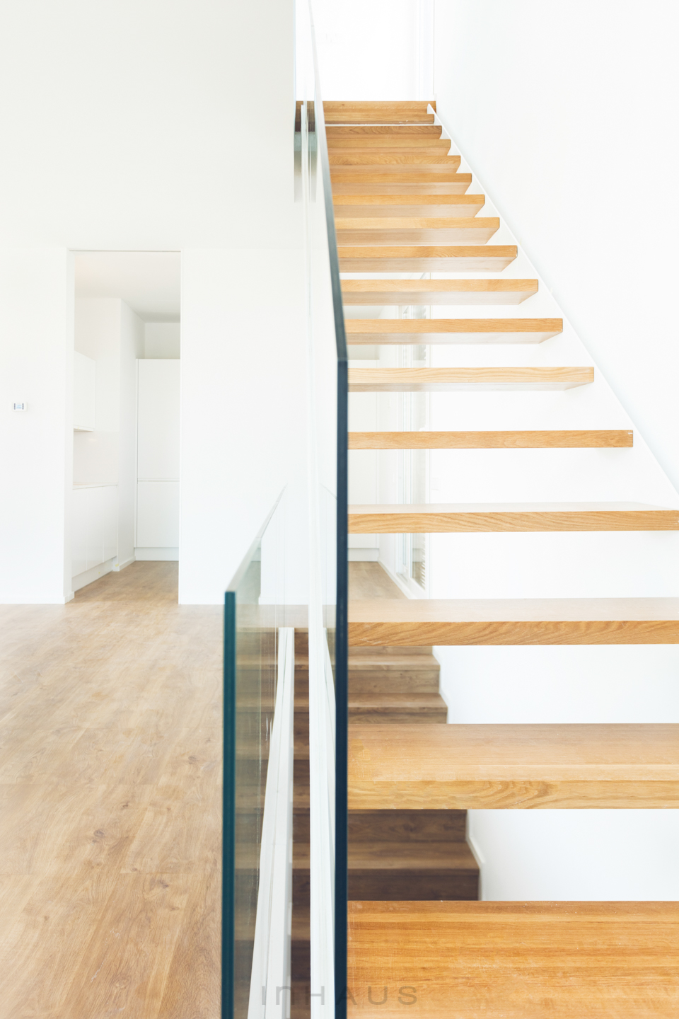 Auch die für die Innenausstattung verwendeten Materialien sind von hoher Qualität und zeitgemäßem Design. Das Glasgeländer, in dem keine Profile sichtbar sind, macht die Treppe zu einer Skulptur, die das Wohnzimmer schmückt.