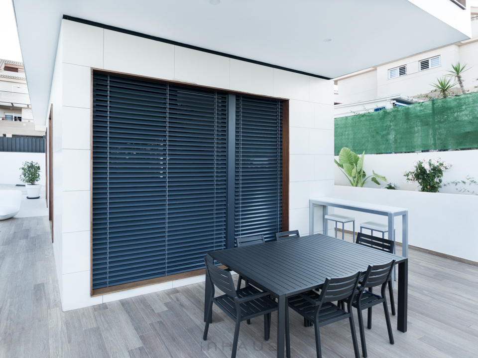 Motorisierte und verstellbare Jalousien sowohl im Tageszone als auch in den Schlafzimmern ermöglichen unseren Kunden die vollständige Kontrolle über das Licht und die Aussicht in ihrer Wohnung.