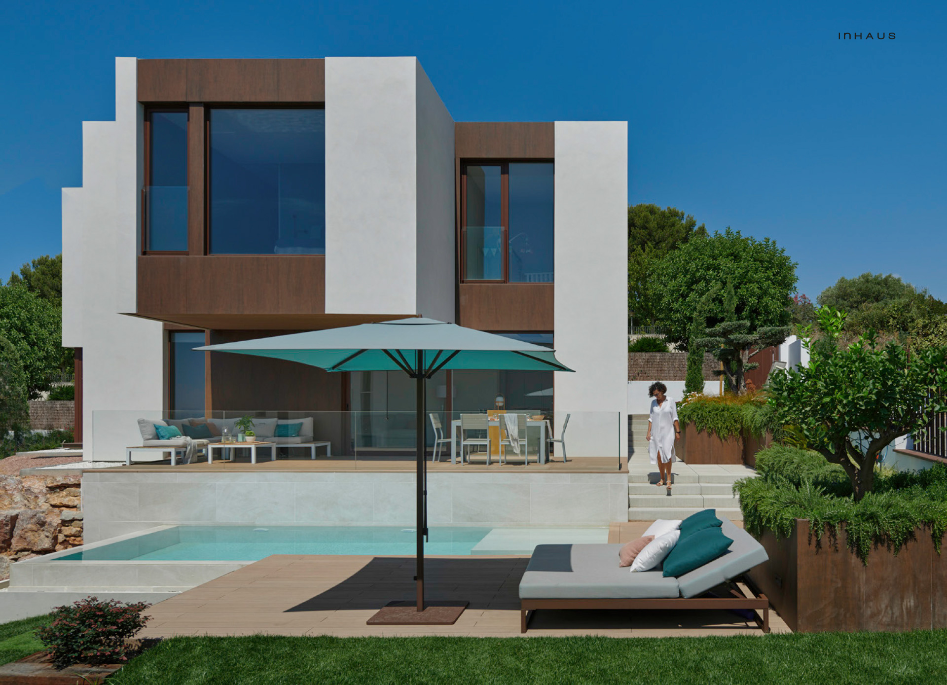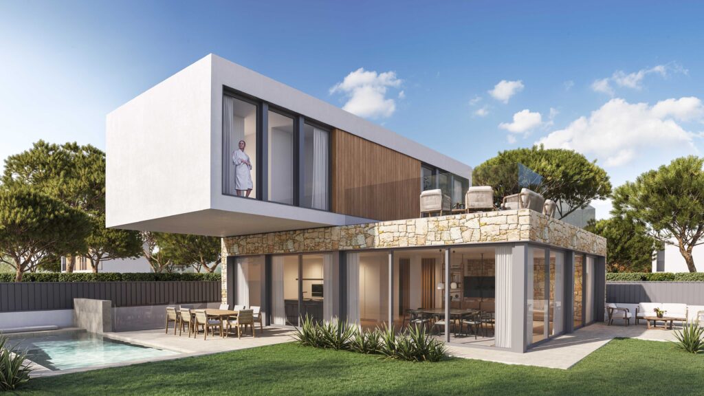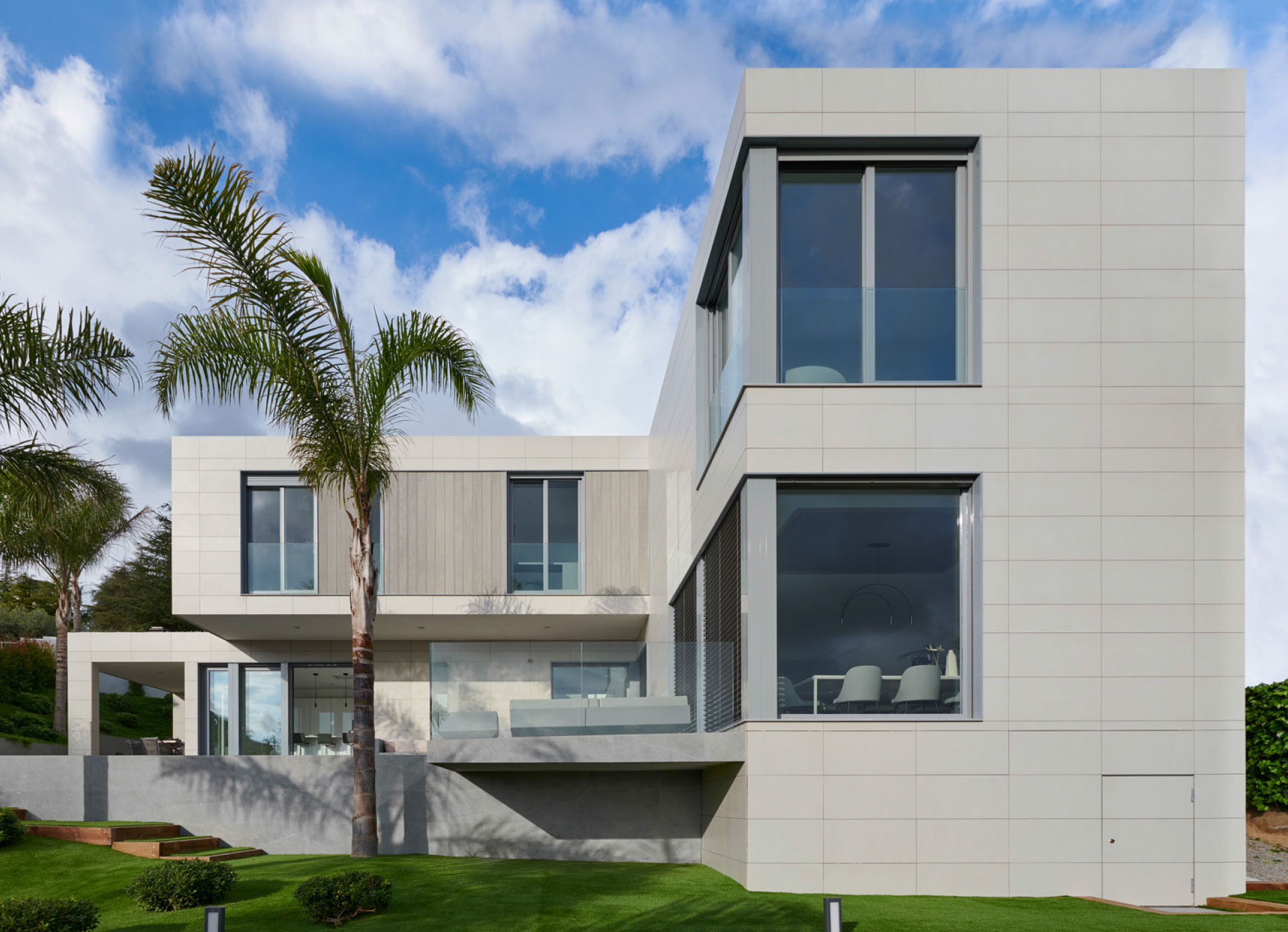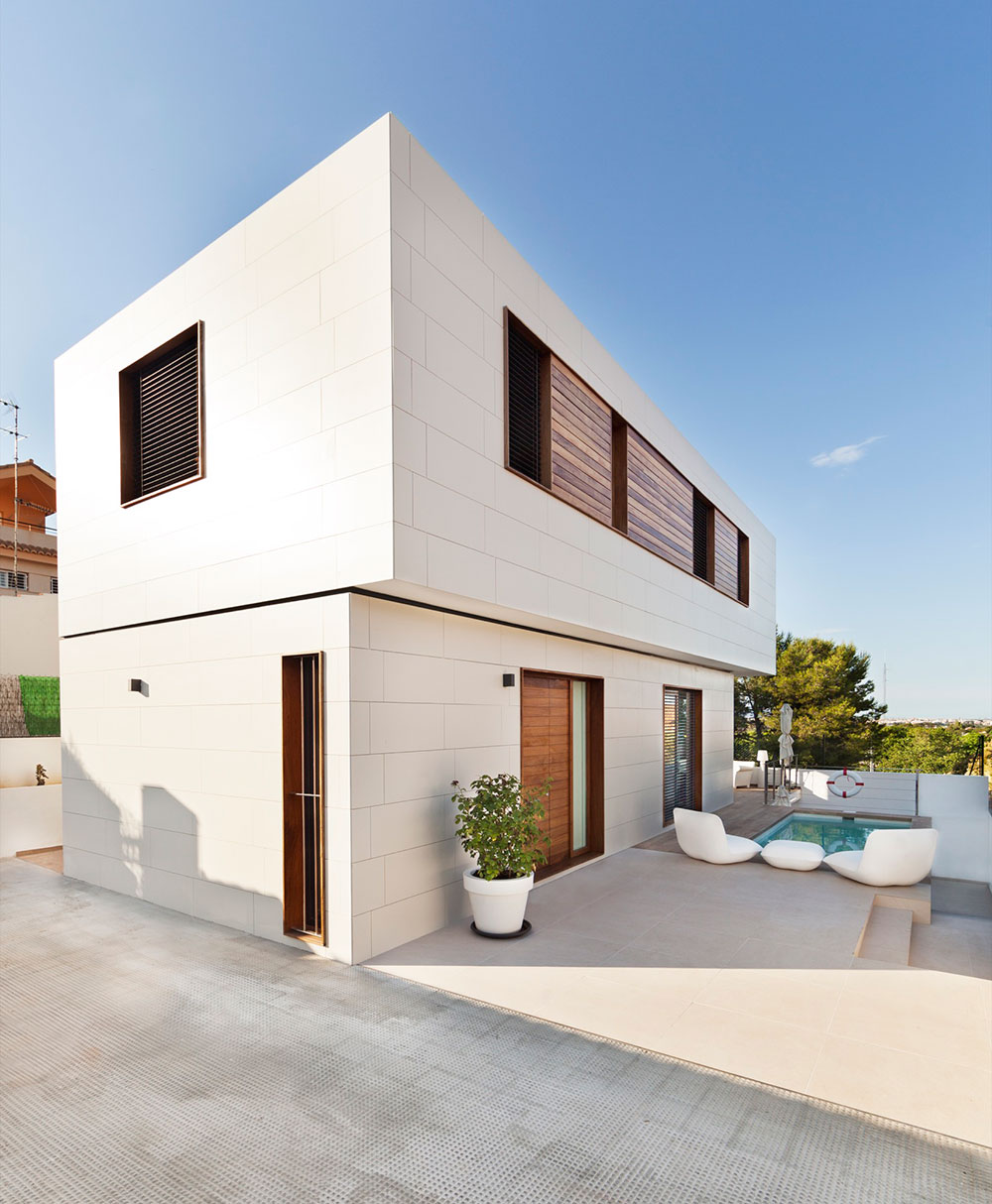 Der Formigal ist eines der eindrucksvollsten Modelle der inHAUS Collection 111. Es ist stolz auf seine mächtigen Auskragungen. Dieses Haus auf Mallorca baut auf seinem Design auf, geht aber noch weiter und eliminiert die Stützen eines seiner Volumen und wächst spektakulär am Rande eines steil abfallenden Geländes..