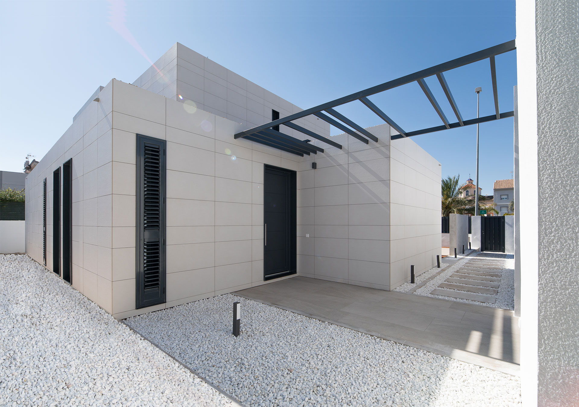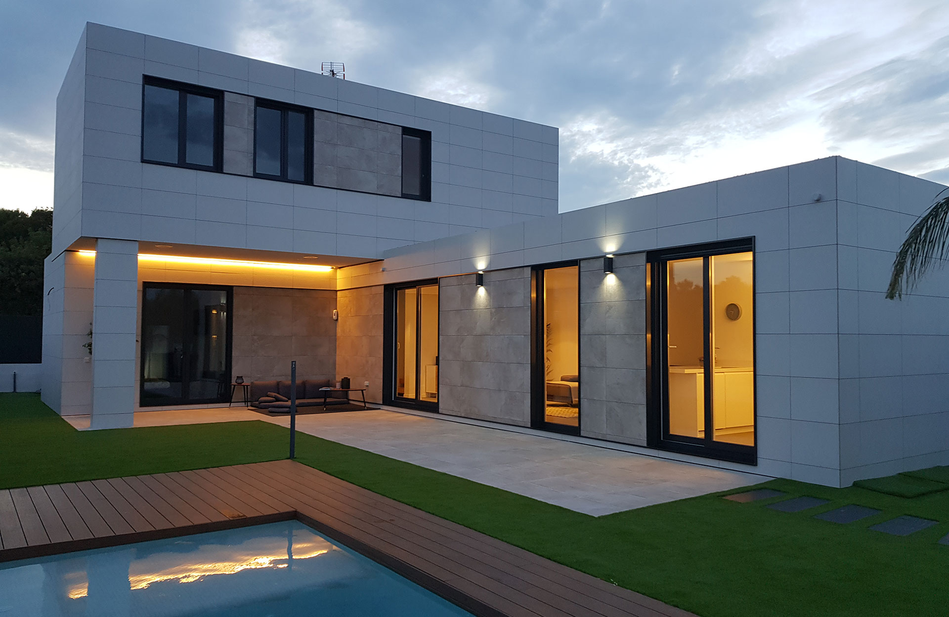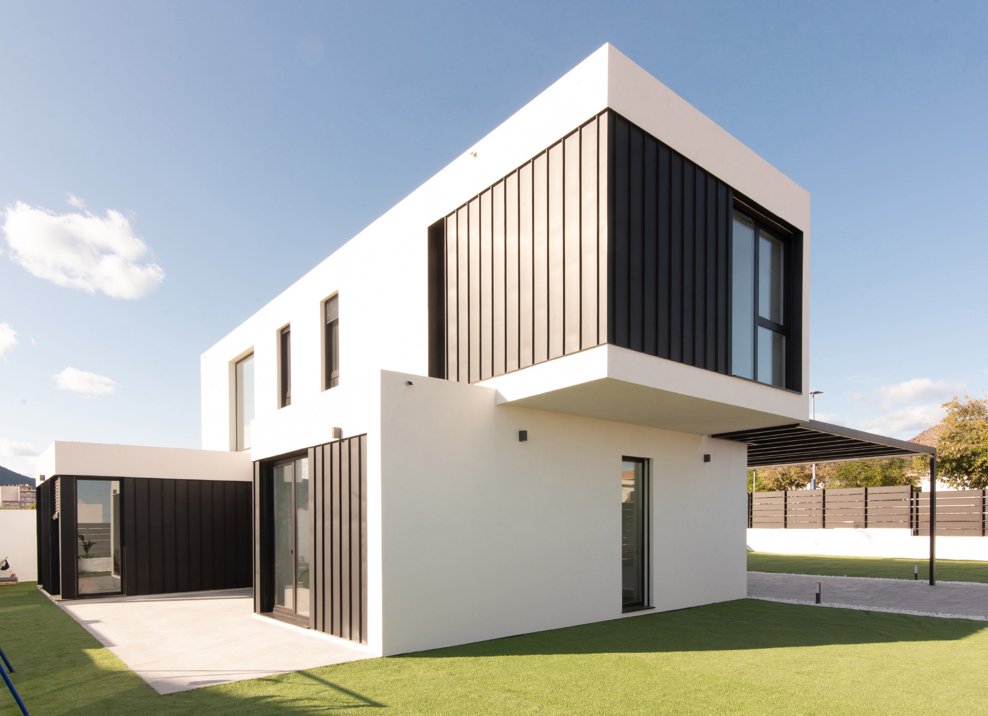 Der Formigal ist eines der eindrucksvollsten Modelle der inHAUS Collection 111. Es ist stolz auf seine mächtigen Auskragungen. Dieses Haus auf Mallorca baut auf seinem Design auf, geht aber noch weiter und eliminiert die Stützen eines seiner Volumen und wächst spektakulär am Rande eines steil abfallenden Geländes..