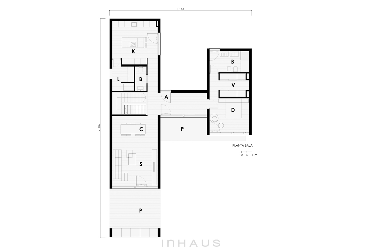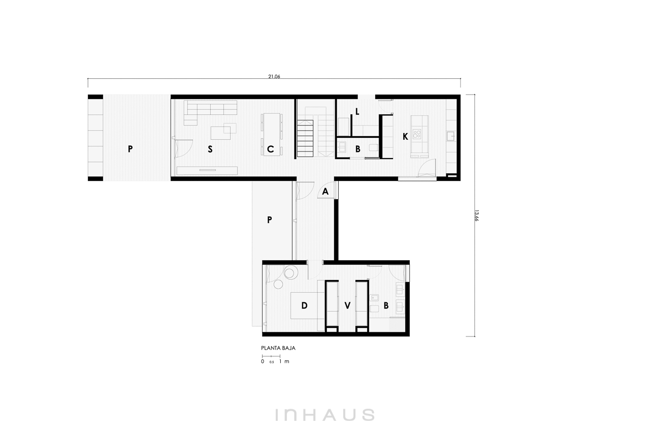 Das Volumen des Obergeschosses steht senkrecht zu dem des Erdgeschosses, das ebenfalls versetzt ist, um eine Veranda zu schaffen.