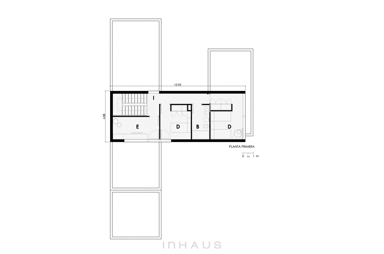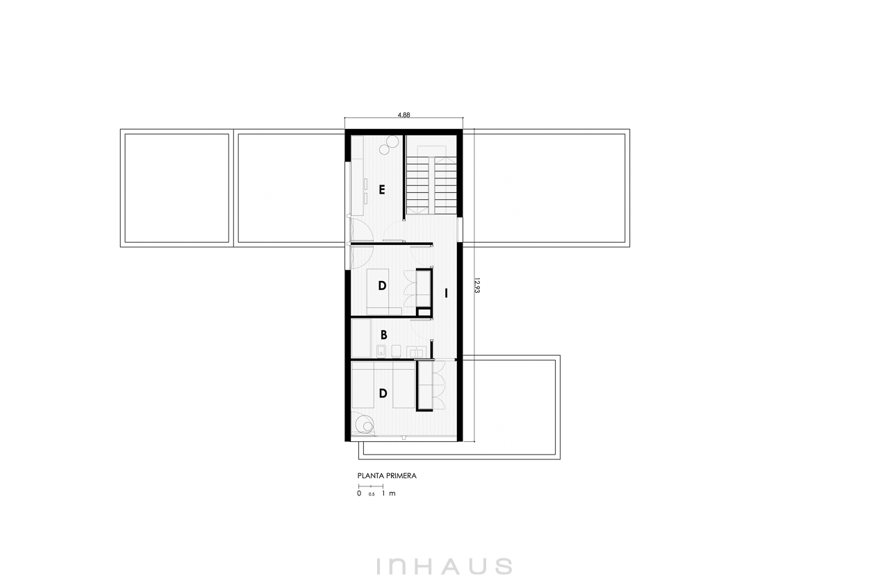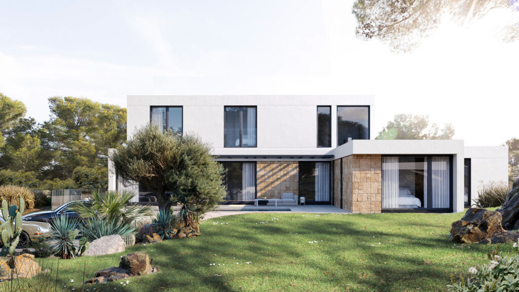 Gekennzeichnete Volumen mit orientierten Ausblicken, wobei die Privatsphäre, die jeder Raum im Haus benötigt, gewahrt bleibt.