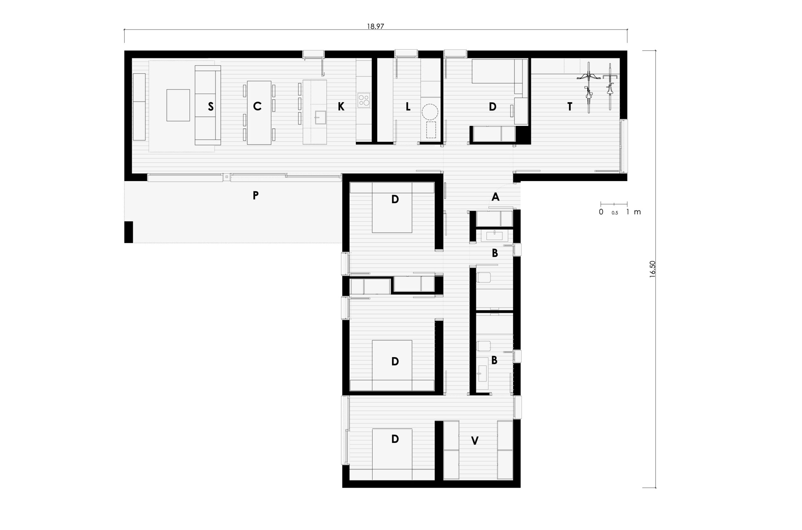 Der Eingang im zentralen Bereich des Hauses ermöglicht die Aufteilung der Tagesbereiche auf der rechten Seite und der Nachtbereiche auf der linken Seite. Das Wohn-Esszimmer und die Küche sind offen gestaltet, so dass ein völlig offener und durchlässiger Raum entsteht, der eine visuelle Kontinuität nach außen aufweist. Es besteht auch die Möglichkeit, den Raum zu schließen, wenn der Kunde dies wünscht. Im Nachtbereich befinden sich vier Einzelzimmer mit Einbauschränken, ein gemeinsames Außenbad und das Hauptschlafzimmer mit Bad und Ankleideraum.