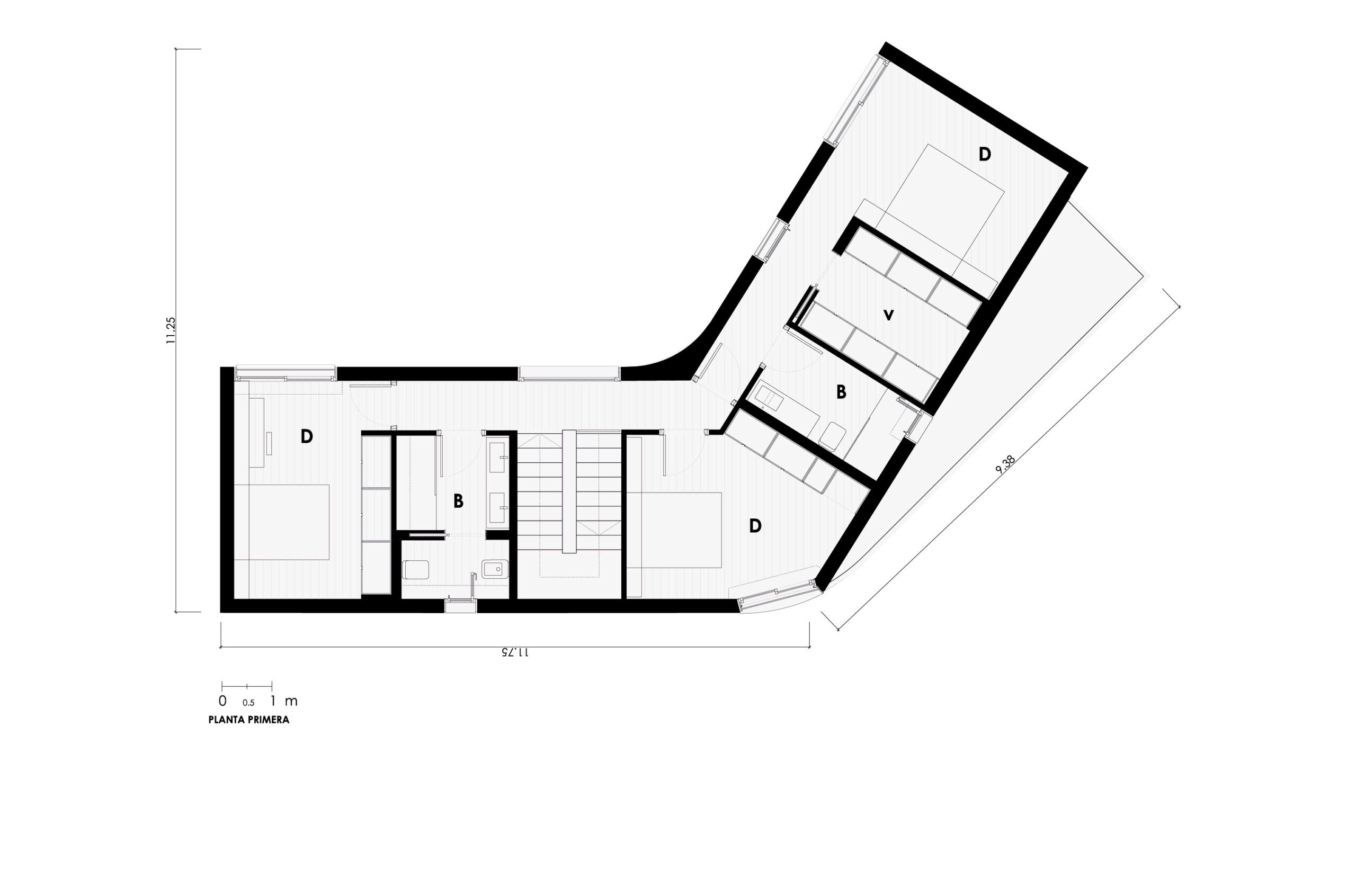 Der Innenraum ist in zwei Bereiche unterteilt, einen tagsüber mit Blick auf den Pool und einen anderen, intimeren Bereich mit Zimmern, die auf die Rückseite des Gebäudes blicken. Beide Bereiche sind dank einer großen Garderobe, die sich über die gesamte Länge des Hauses erstreckt, unabhängig voneinander.