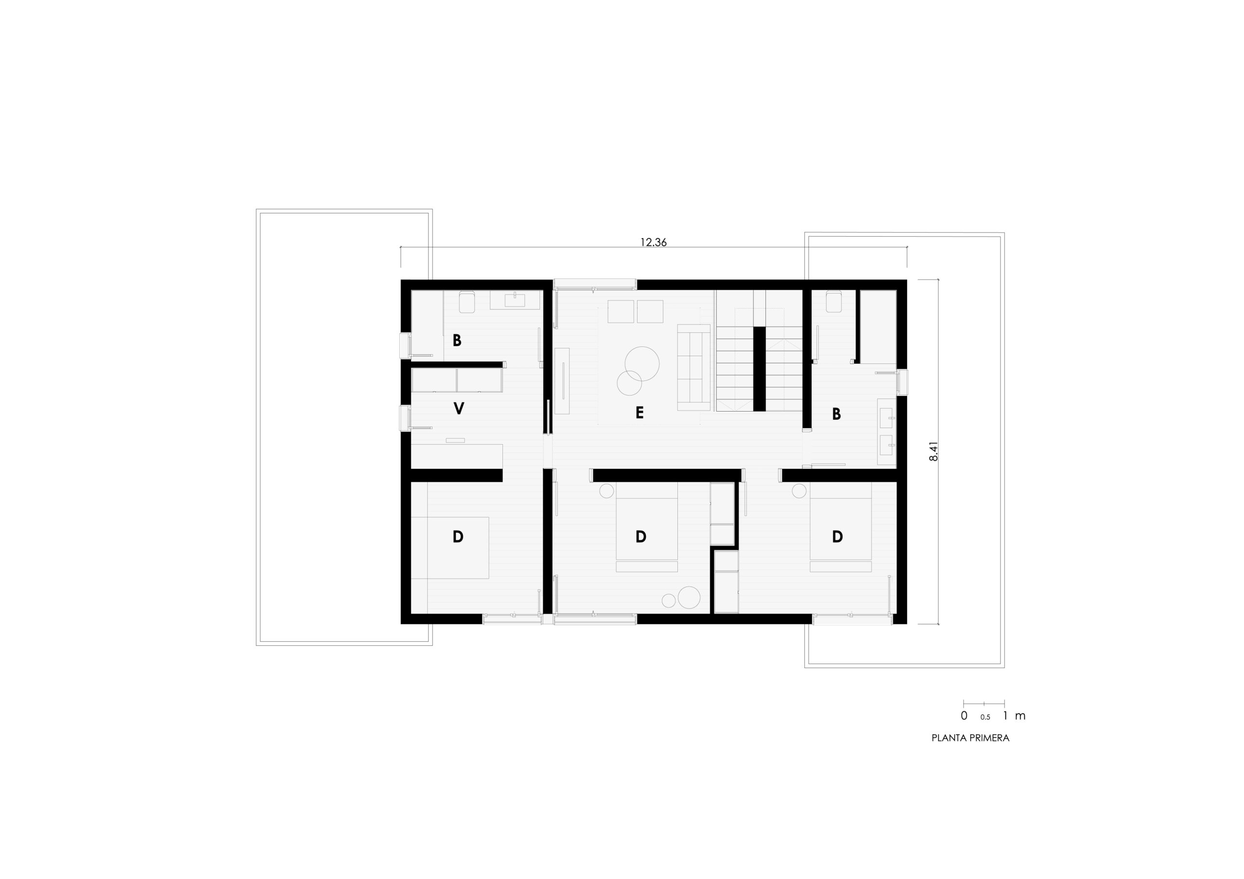 Im Erdgeschoss schließen die Baukörper an den Enden den Komplex ab, wodurch ein geschlossener Außenraum entsteht, der mit dem Tagesbereich verbunden ist und von dem Volumen im ersten Stockwerk überdeckt wird. Um diesen Raum herum gliedert sich der Tagesbereich, der der Familie zur Verfügung steht. Ebenfalls im Erdgeschoss, in einem anderen Raum, befindet sich das große Hauptschlafzimmer mit Ankleideraum und funktionellem Bad en suite. Im ersten Stock befinden sich drei Doppelschlafzimmer, ein komplettes Bad und ein Mehrzweckraum neben der Zugangstreppe.