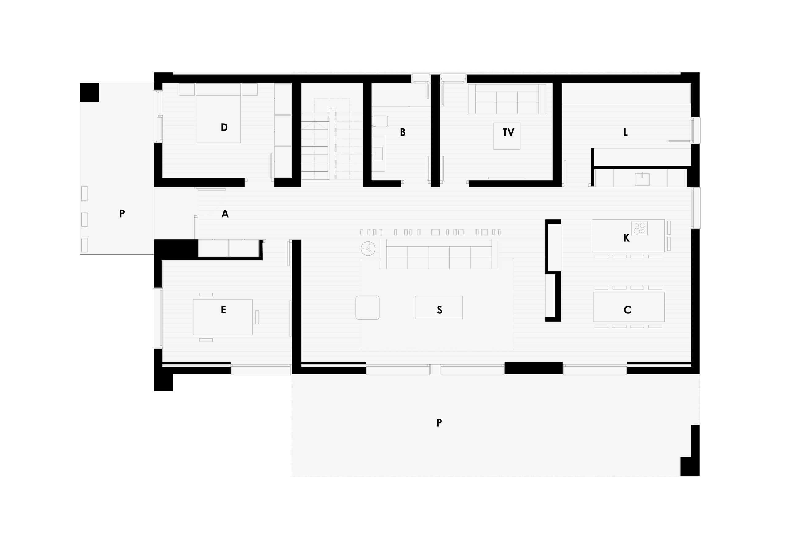 Das Esszimmer ist halb mit dem Wohnzimmer verbunden, so dass beide Bereiche Privatsphäre haben, ohne die Verbindung zwischen ihnen zu verlieren. Die Wohnküche ist Teil des Esszimmers, mit einer großen Bar, die beide Räume miteinander verbindet. Hinter der Küche befindet sich eine große Waschküche, die auch als zusätzliche Speisekammer für die Küche genutzt werden kann.
