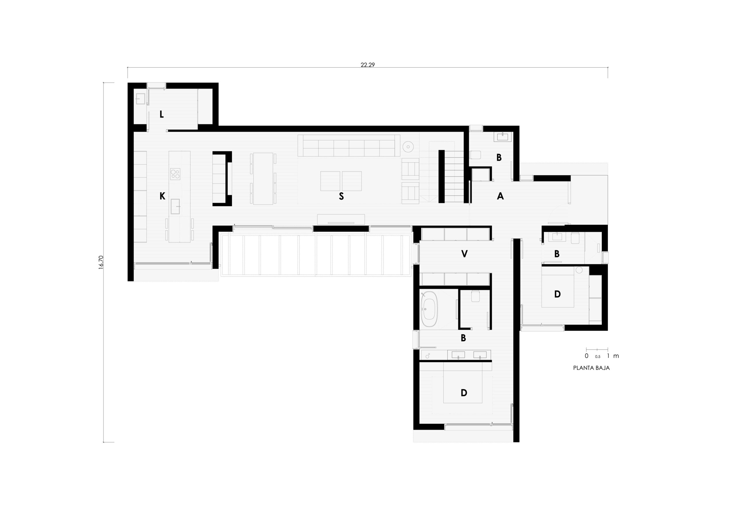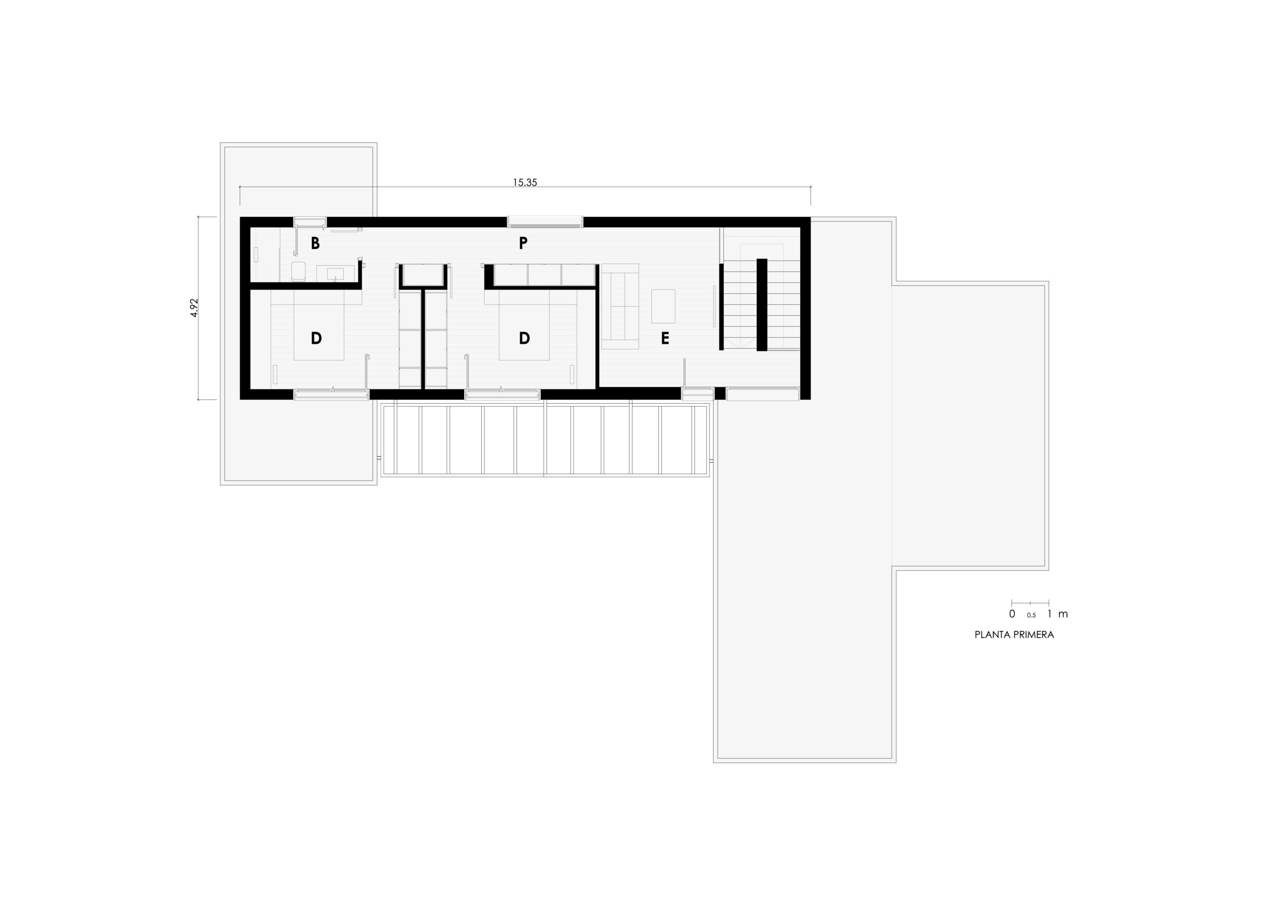 Im Erdgeschoss schließen die Baukörper an den Enden den Komplex ab und schaffen einen geschlossenen Außenraum, der mit dem Tagesbereich verbunden ist. Der Tagesbereich gliedert sich um diesen Raum, der der Familie zur Verfügung steht. Ebenfalls im Erdgeschoss, in einem anderen Volumen, befinden sich ein großes Hauptschlafzimmer mit Ankleideraum und funktionellem Bad en suite sowie ein weiteres Doppelzimmer mit Bad. Die Küche ist als ein weiterer senkrechter Arm gegliedert, der den Außenbereich umschließt.